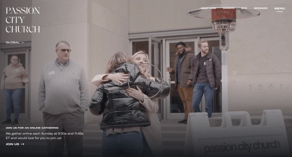 Why it works: Passion City Church has a beautiful layout with videos that play on the home page as you enter. They have a tab at the top of the page that says “Start Here” that goes into detail about the beginning of the church and tells you a little more about their Lead Pastor Louie Giglio and his wife Shelley. They invite you to join them for a Sunday service either in person or online with their service times clearly posted. Their website is clean and as you hover your mouse over different sections, it highlights them with images behind it. This is a great Christian church to be inspired by.