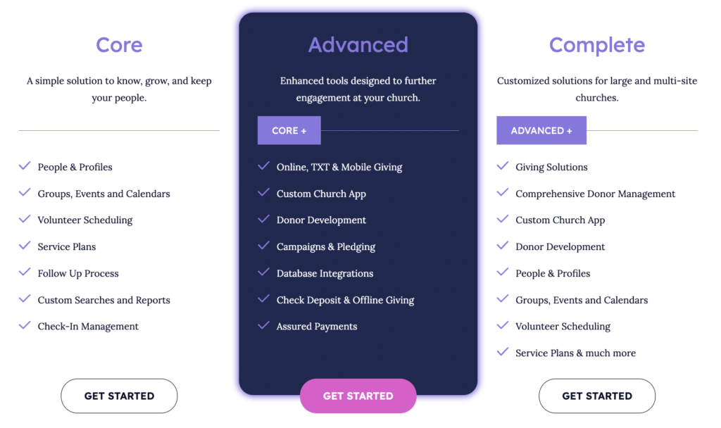 Pushpay offers three pricing packages, you can visit their site to request a quote and get more details. The three plans offered are: