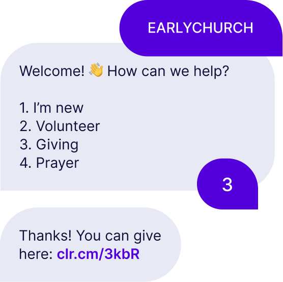 For example, a church member could text the word “PRAYER” to a certain number. Then, the service adds them to the prayer team so they can start receiving automated text messaging with prayer requests and updates.