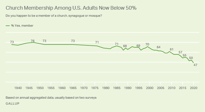 - Decline in Church Membership: As of 2020, less than half of Americans (47%) said they belonged to a church, synagogue, or mosque. This is a significant drop from the 70% membership rate recorded in 1999.
